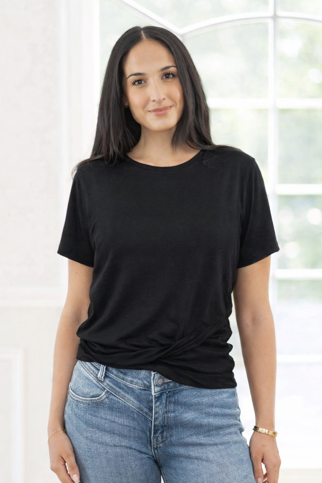 This top has everything you need (get it?) - a stylish trimming edge, cropped design, and flattering short sleeves. A versatile addition to any wardrobe, it's the perfect choice for an effortlessly cool and playful look. Say hello to your new go-to top!!