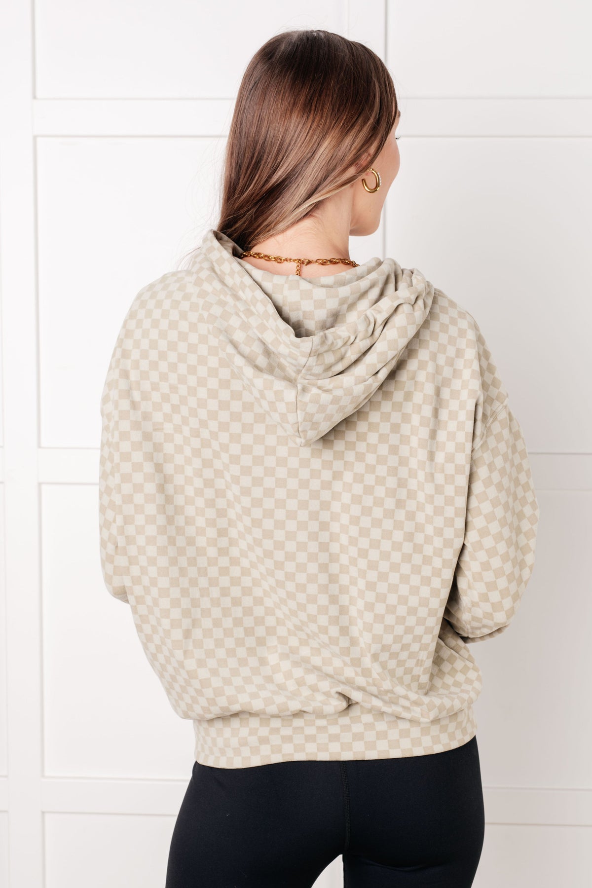 Stay warm and stylish with this trendy Ask Me Out Checkered Hoodie in Sage. Made from performance fleece, this hoodie has a drawstring hood, kangaroo pocket, and banded hemline and cuffs. Perfect for any cool adventure, this hoodie checks all the boxes!