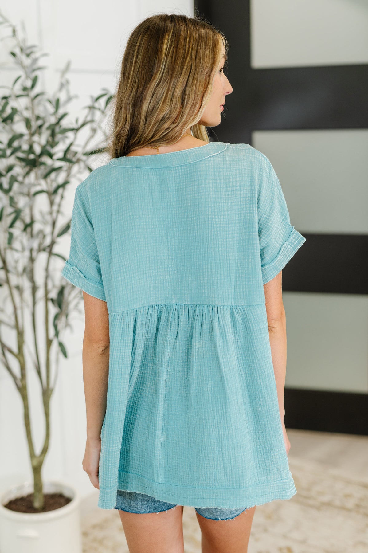 Basic Fade V-Neck Acid Wash Top in Dusty Teal