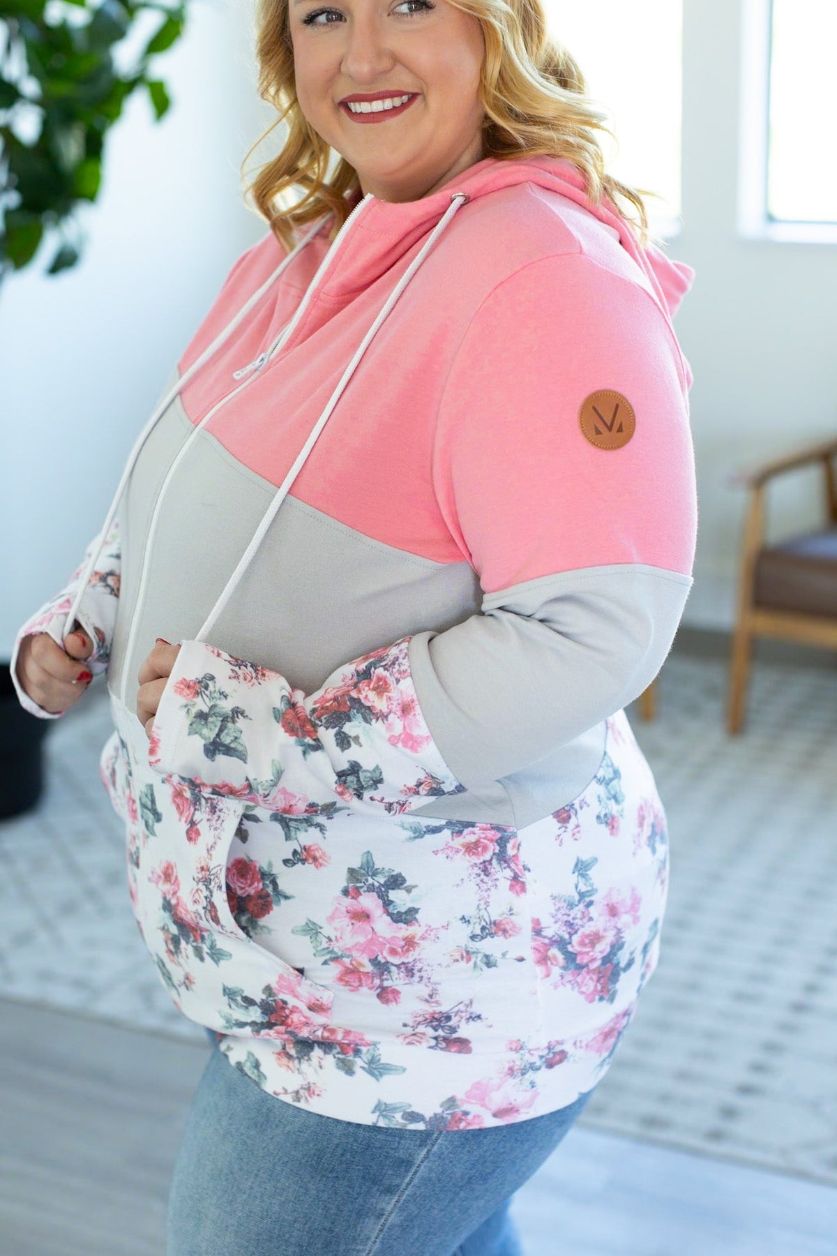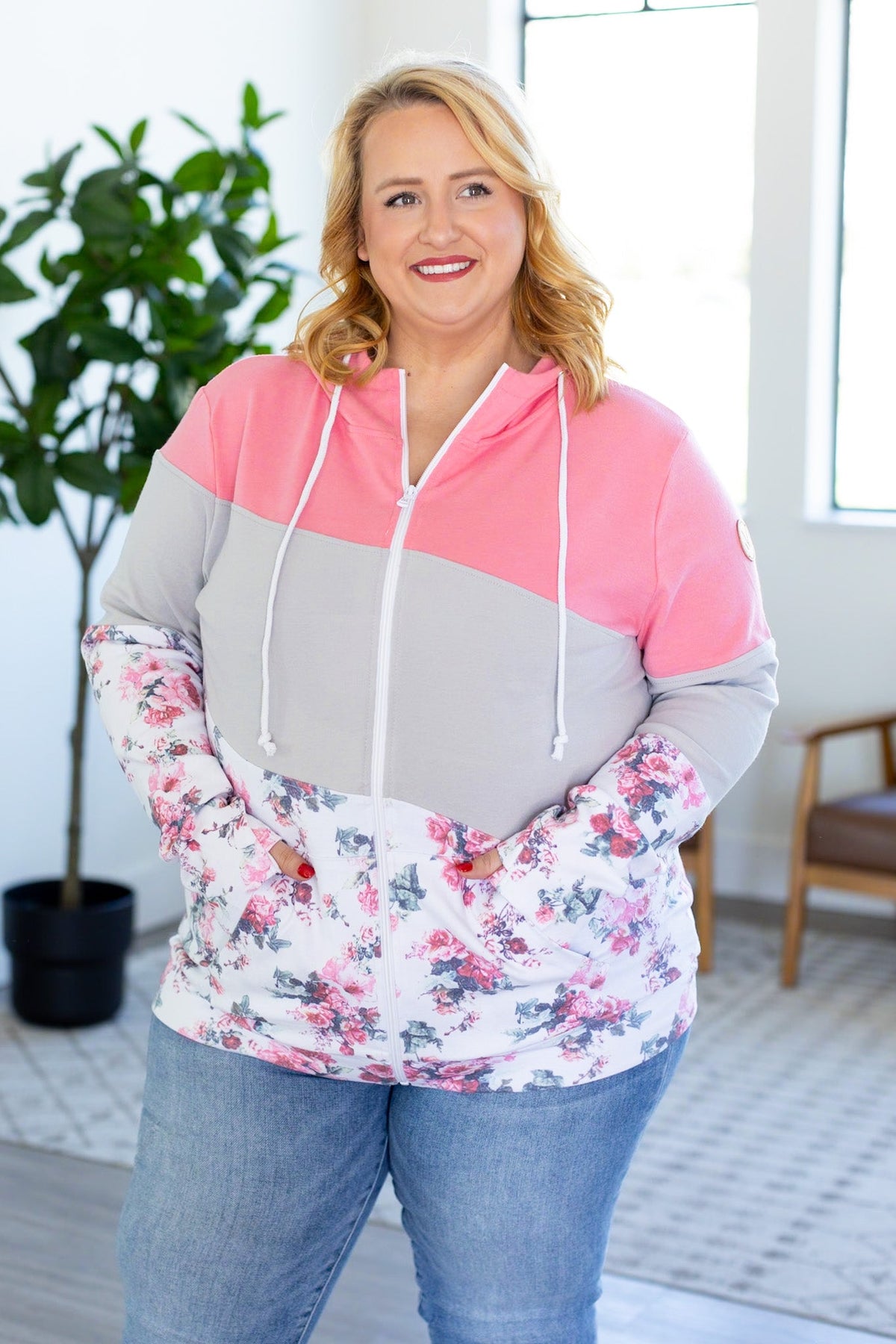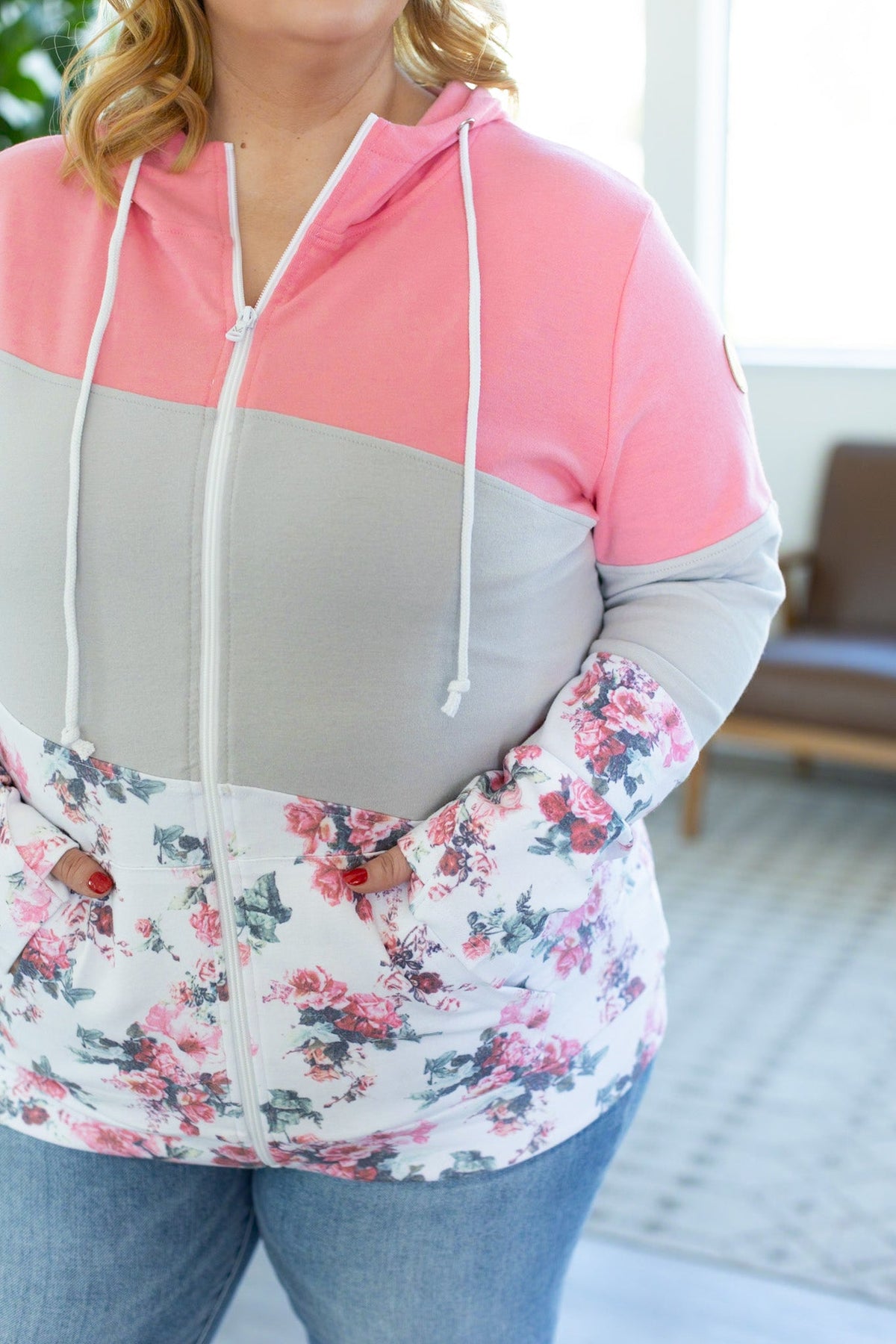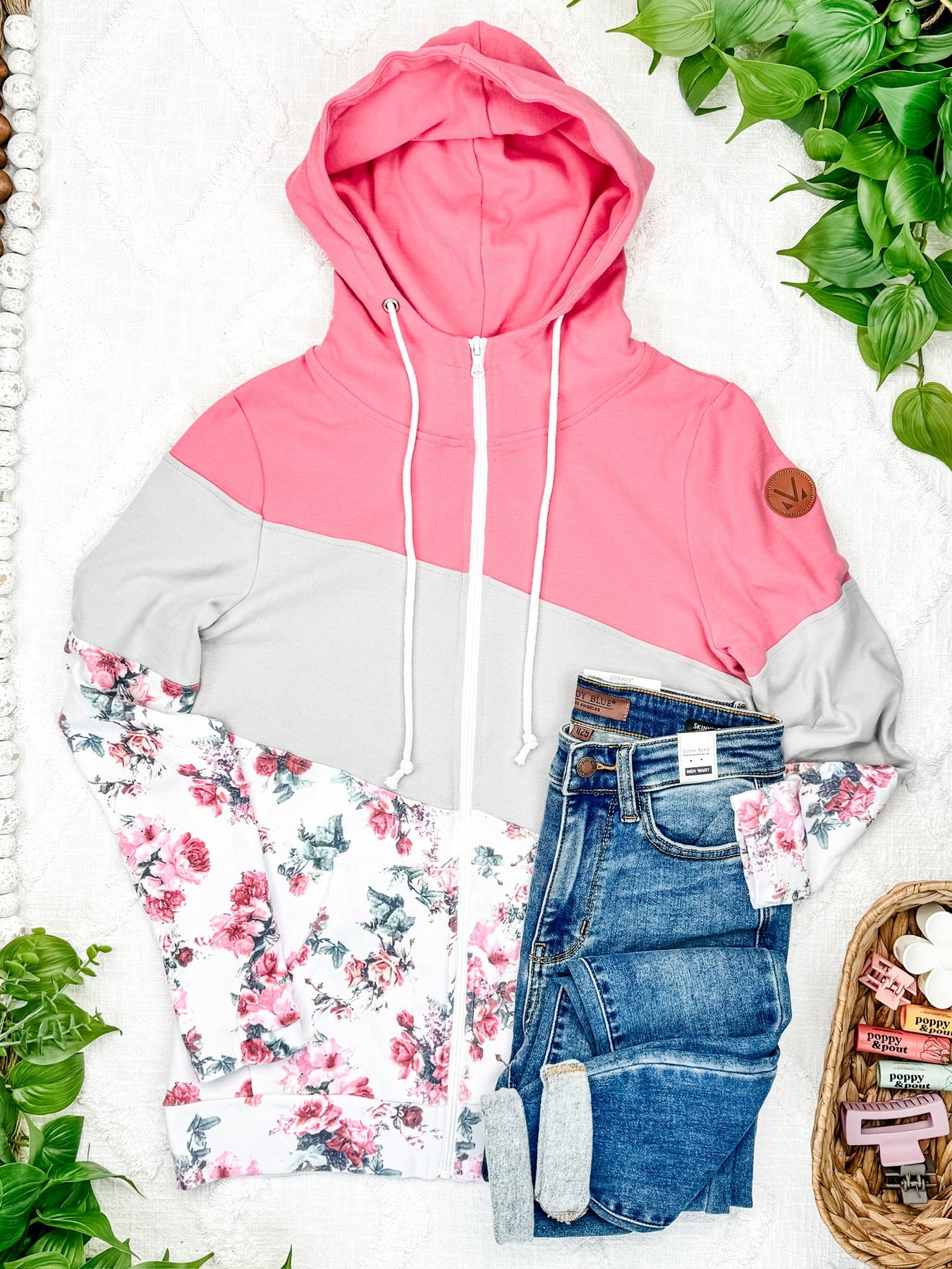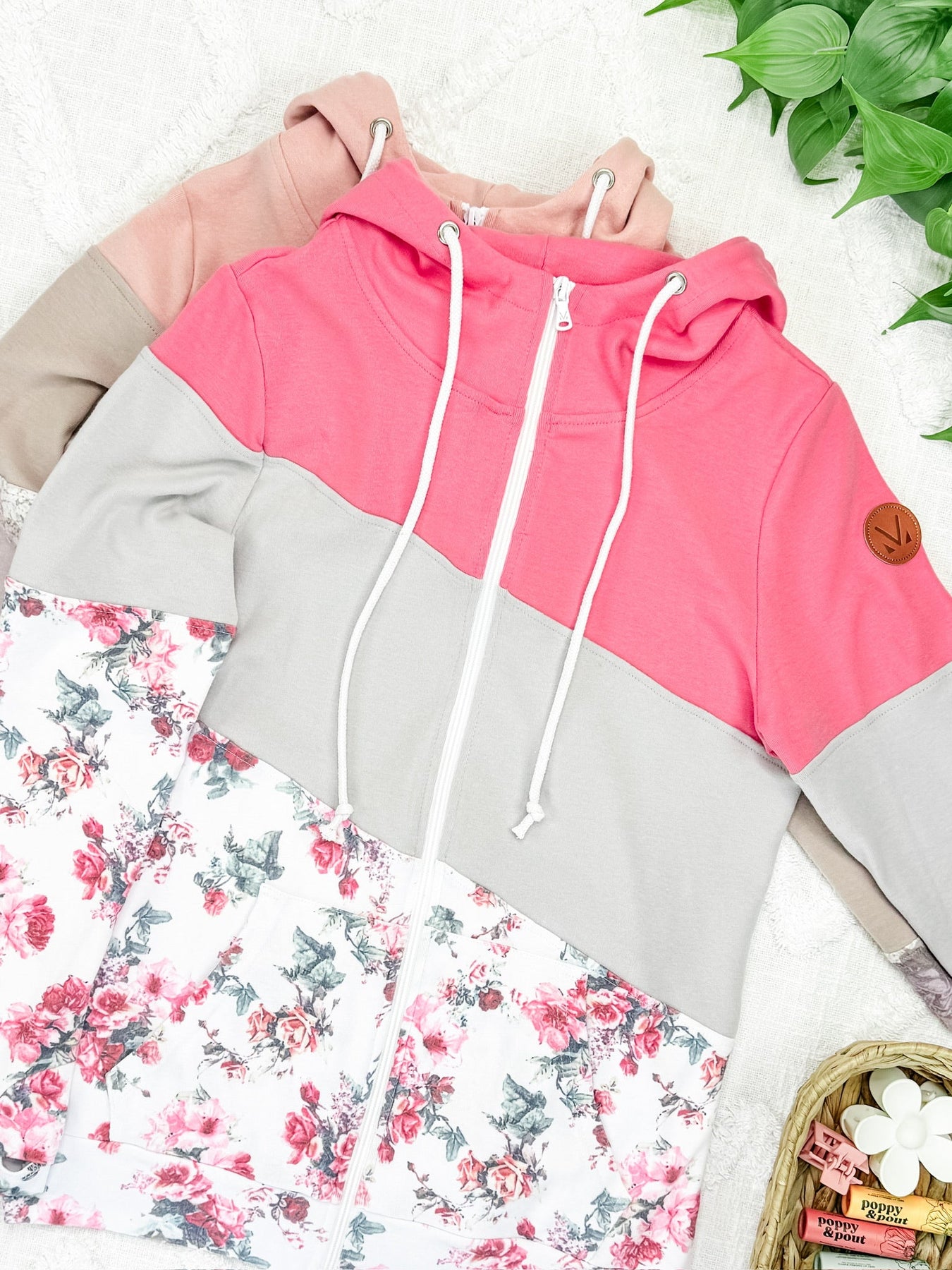 Cuddle up in style for the season! Our ultra-stretchy sweatshirt is crafted from triple-stretch material. Features a classic full-zip front with strings & thumbholes! Colorblock trio with a floral accent makes it a must-have. Fits true to size with amazing stretch.