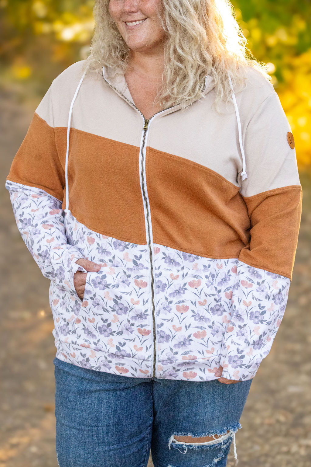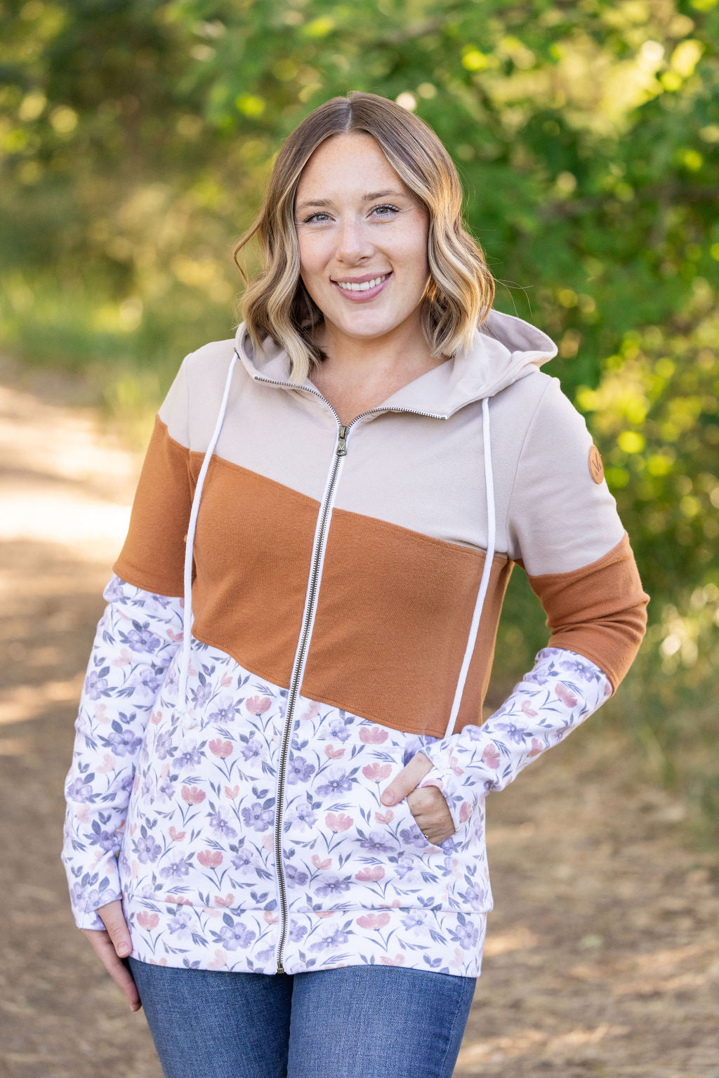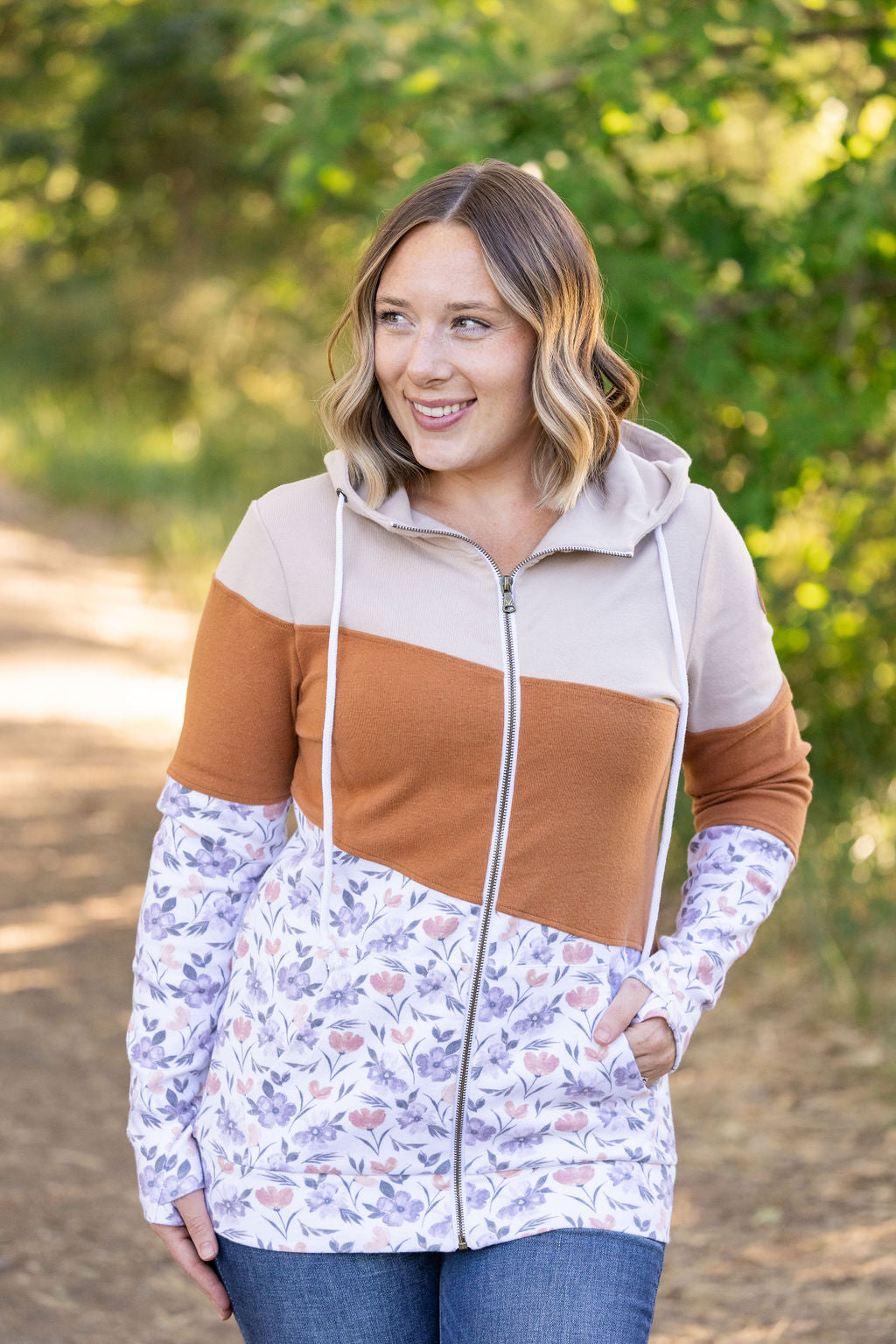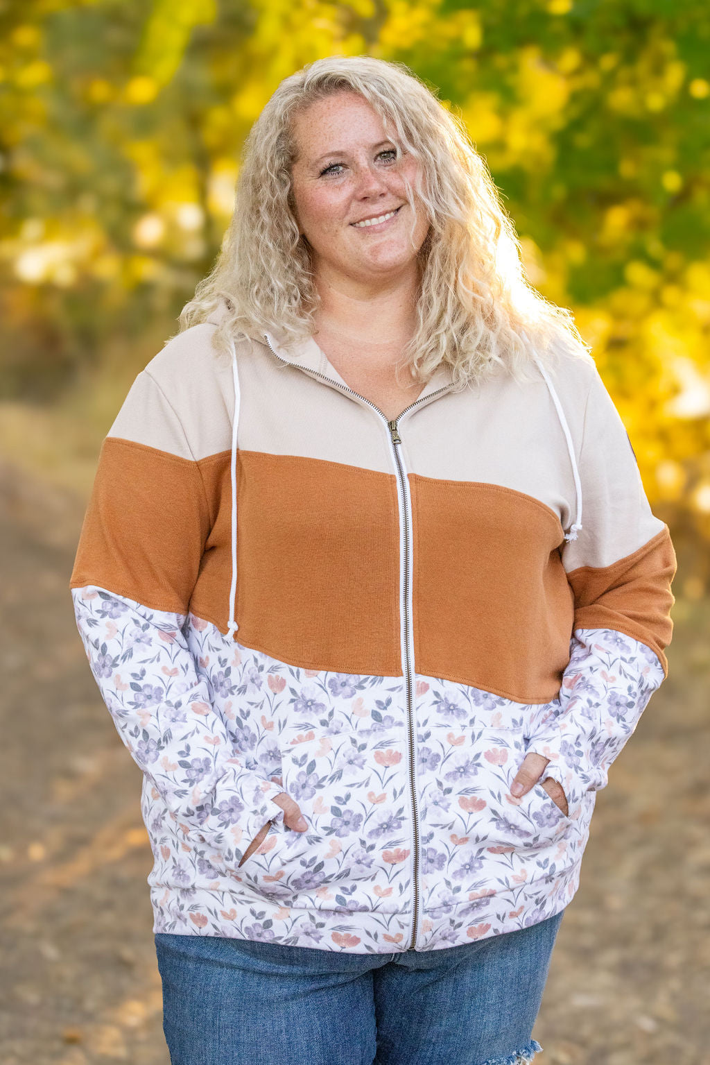 Experience ultimate comfort and style with our Colorblock Fullzip. Made from a triple stretch fabric, this hoodie offers a perfect fit and freedom of movement. Its colorblock design features a warm and inviting blend of tan on the top, a rust camel in the middle, and the harvest floral mix on the bottom, making it the perfect addition to your wardrobe.