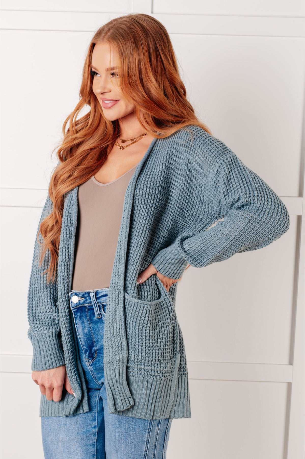 Stay cozy and stylish in our Everything Layer Waffle Knit Open Front Cardigan. The waffle knit adds texture, while the open front and drop shoulder provide a relaxed fit. Functional patch pockets keep your necessities on hand, and the ribbed sleeve cuff and hemline add a nice finish. Plus, side slits for added movement. Perfect for any chilly day.