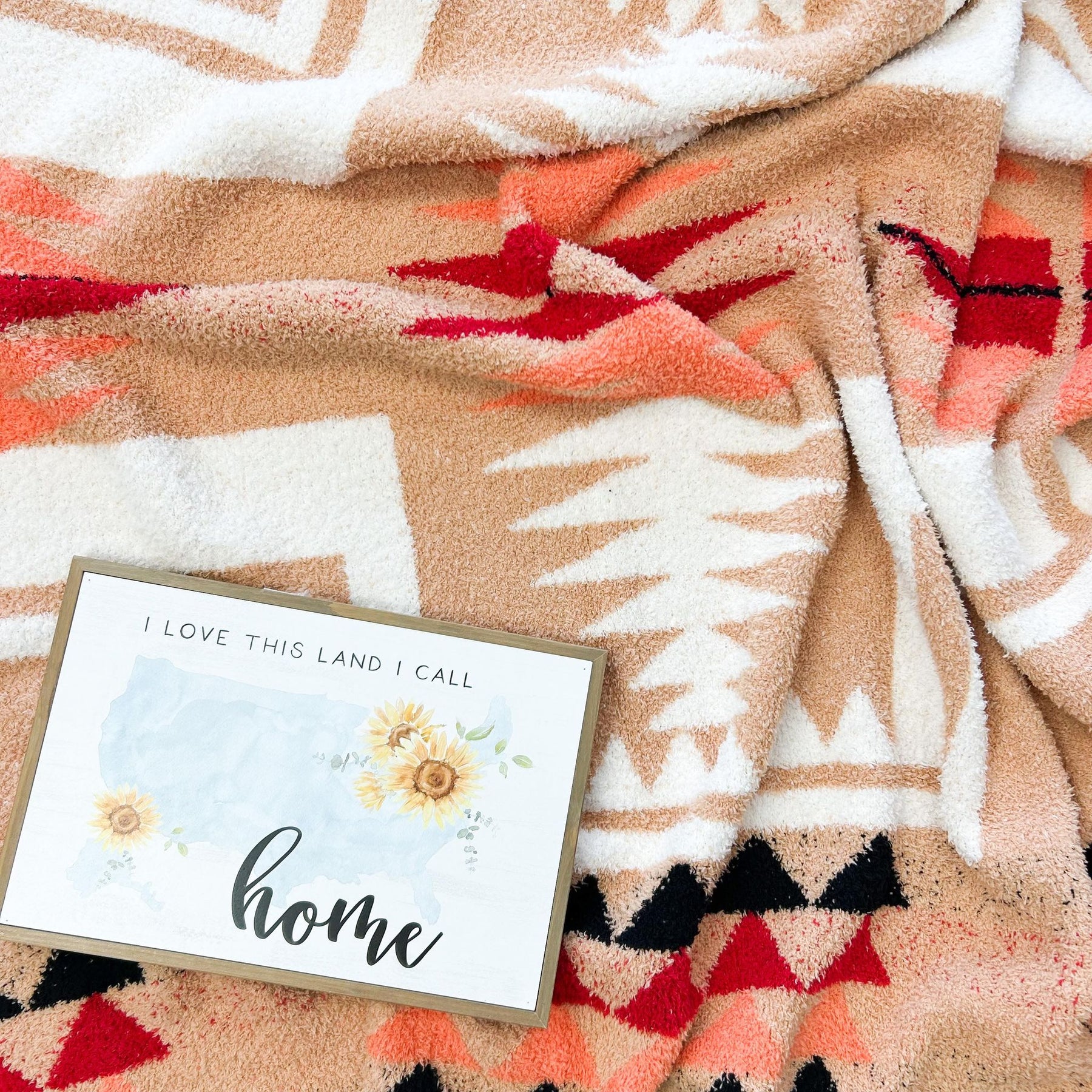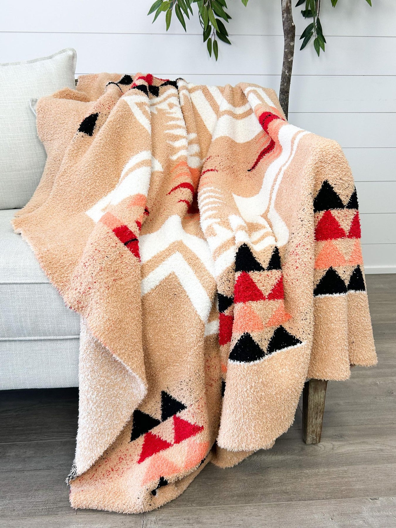IN STOCK Plush and Fuzzy Blanket - Tan, Black, and Red Aztec