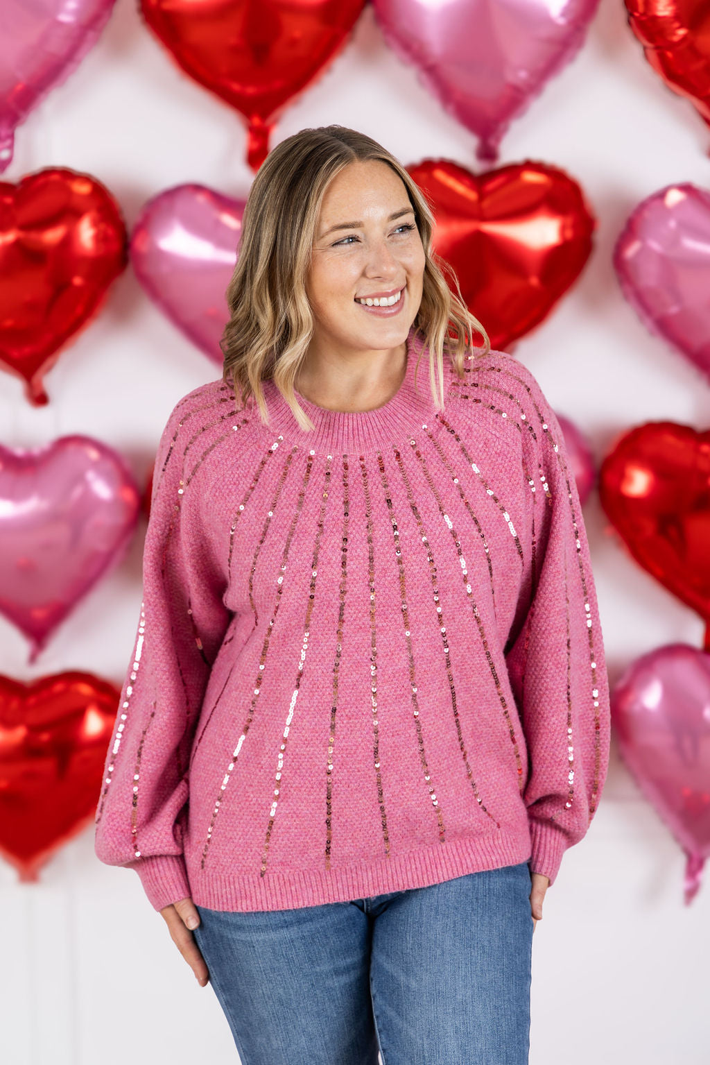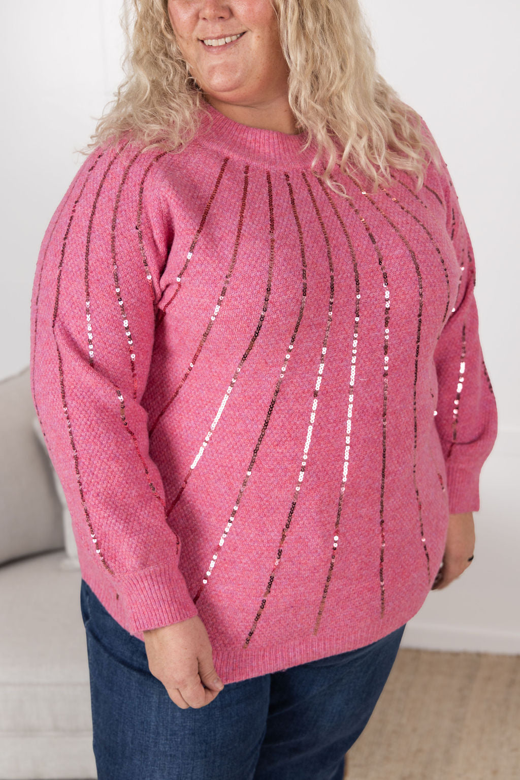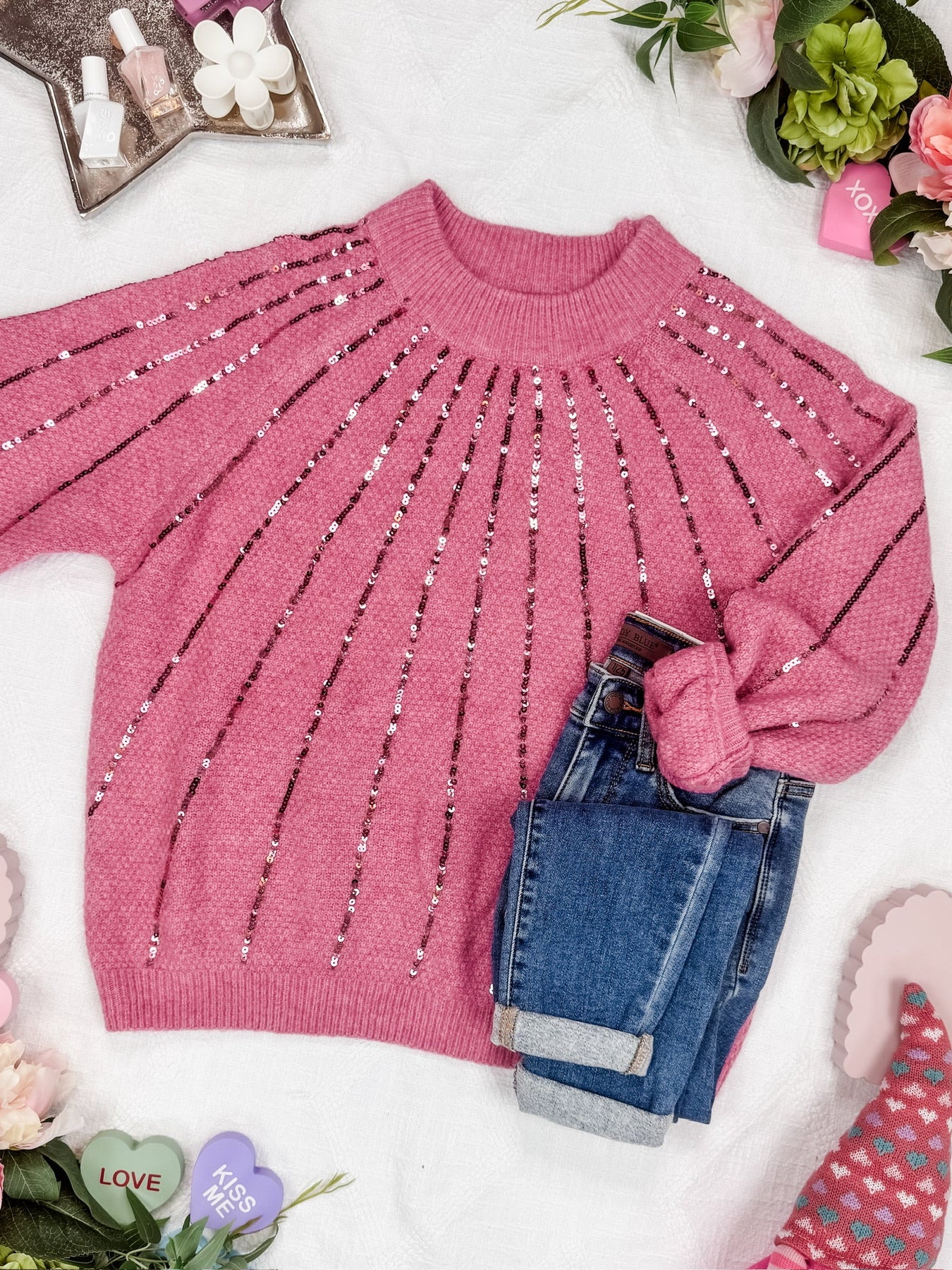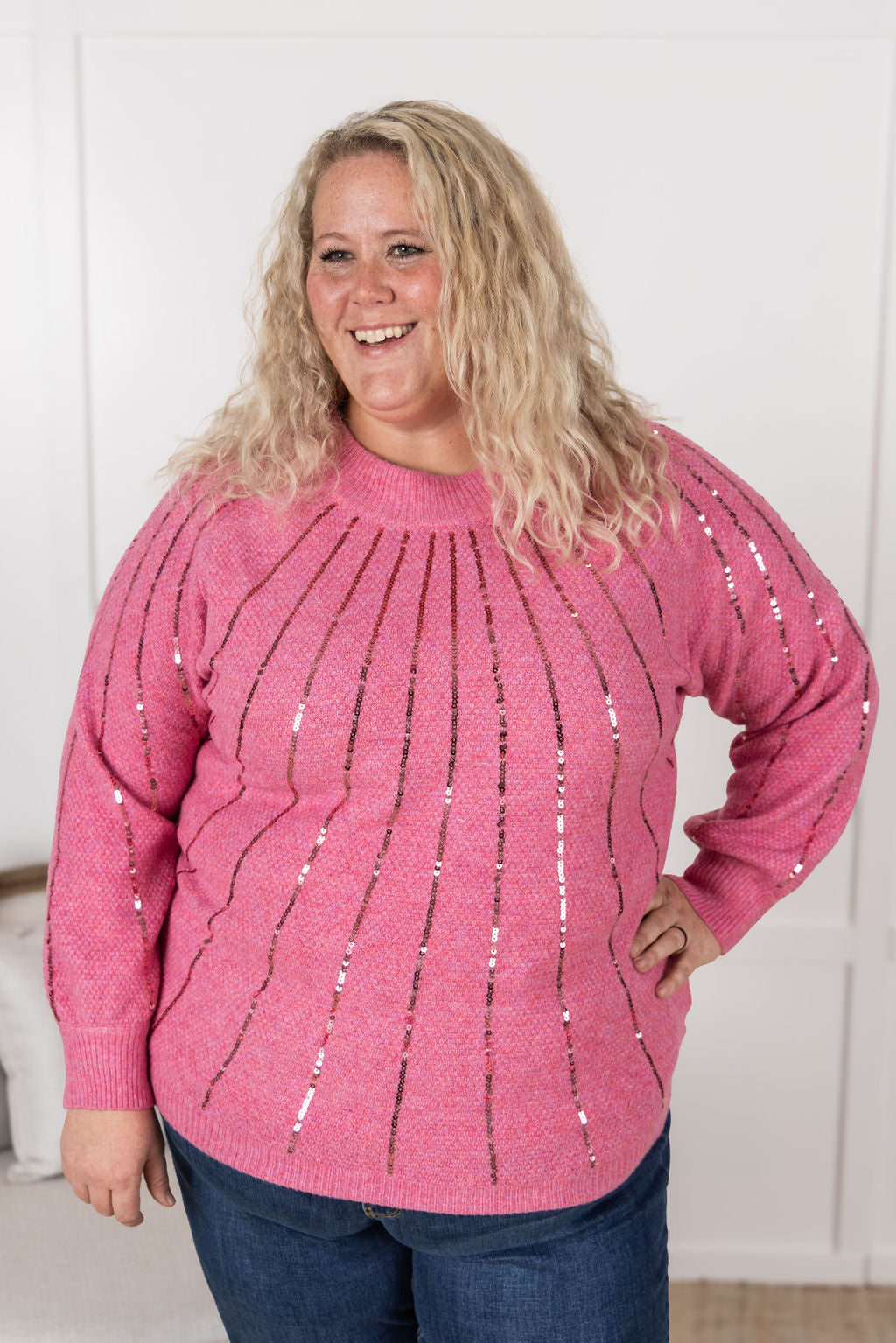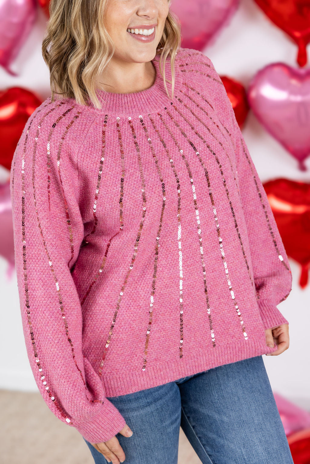 Sparkle in style with our Sparkle Stripes Sweater. This pink sweater is sure to brighten up your wardrobe, with its sparkling stripes adding a touch of glamour to any outfit. Get ready to make a statement and shine with happiness!
