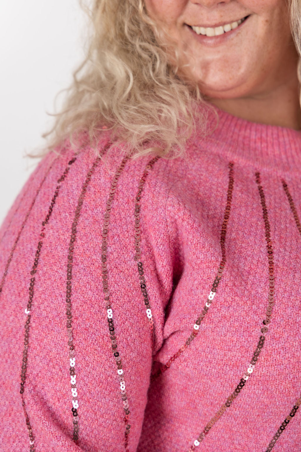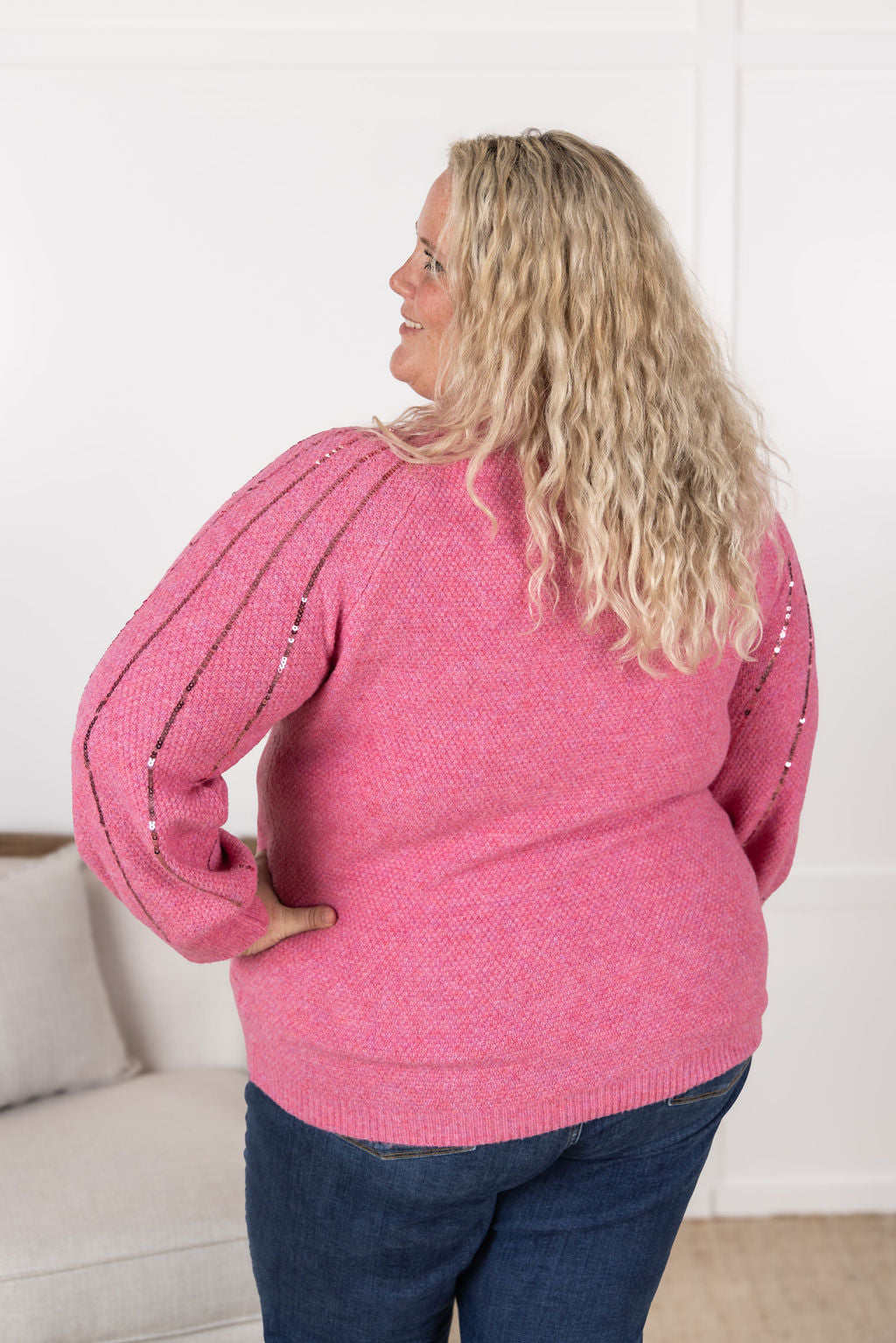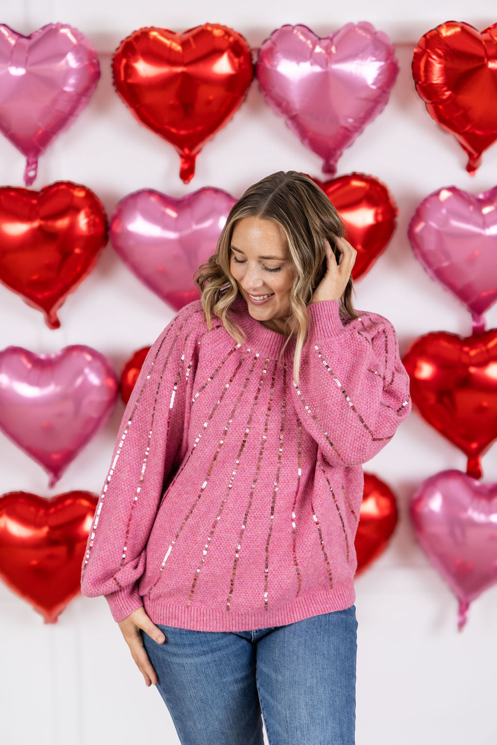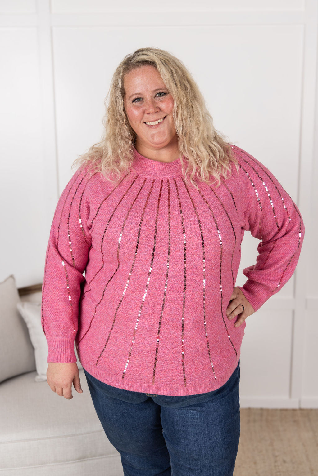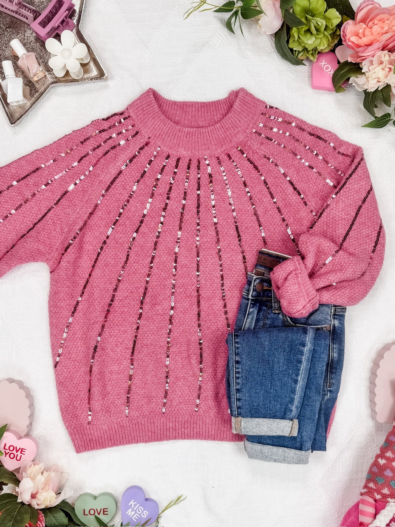 Sparkle in style with our Sparkle Stripes Sweater. This pink sweater is sure to brighten up your wardrobe, with its sparkling stripes adding a touch of glamour to any outfit. Get ready to make a statement and shine with happiness!